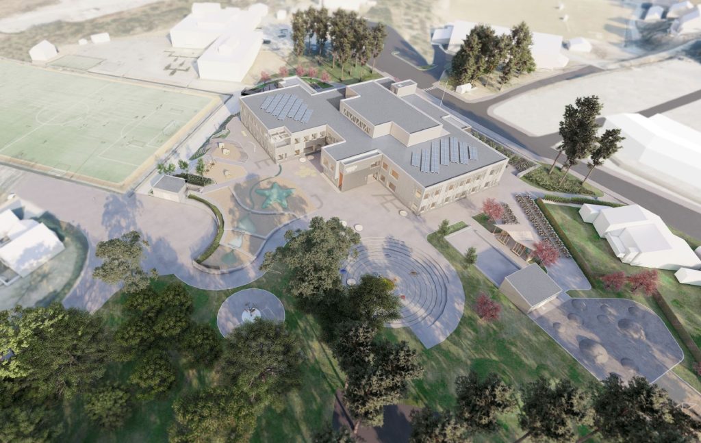 Illustrasjoner: Arkitektfirma Henning Larsen 2023-2024. Vågsbygd skole i Kristansand kommune. Utvidelse av eksisterende skole med 3500 m2. Skanska er totalentreprenør.